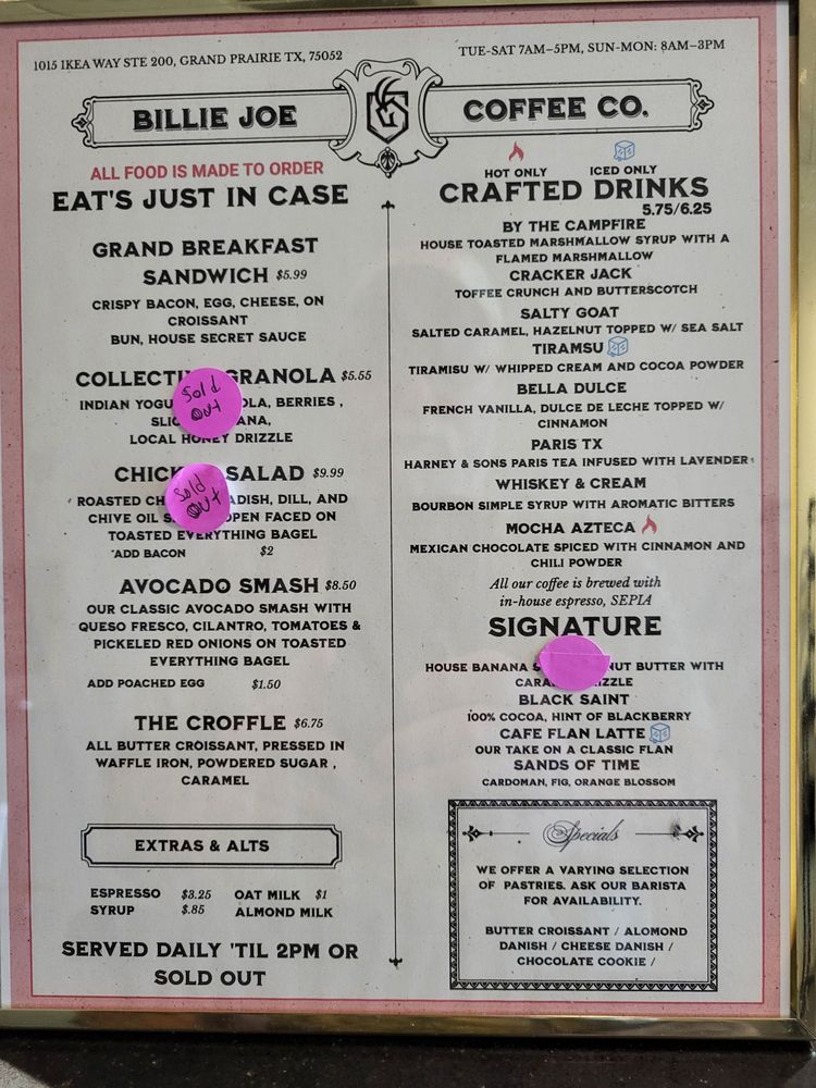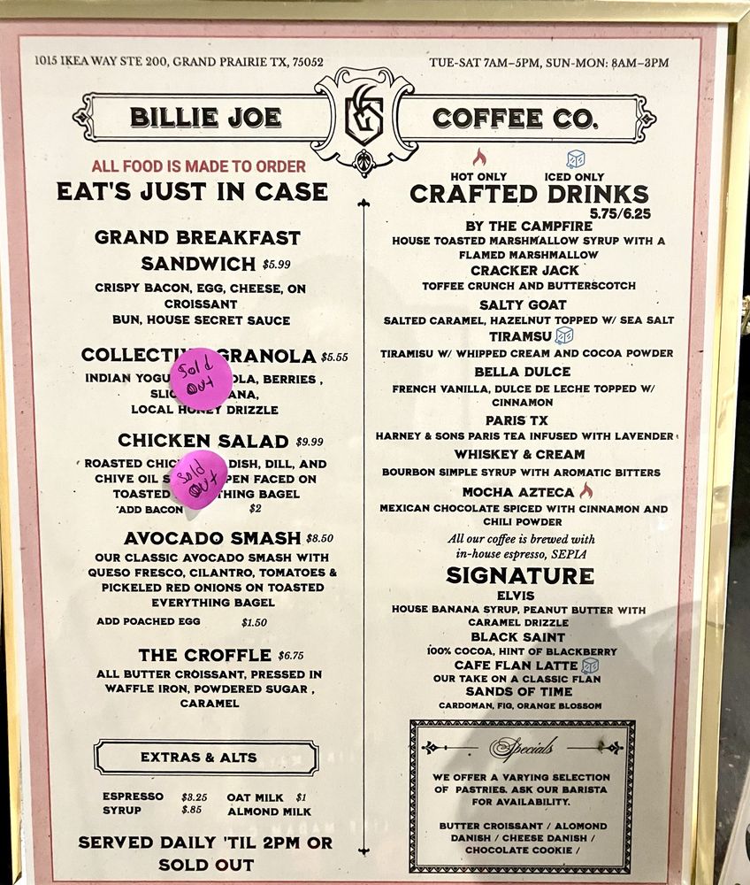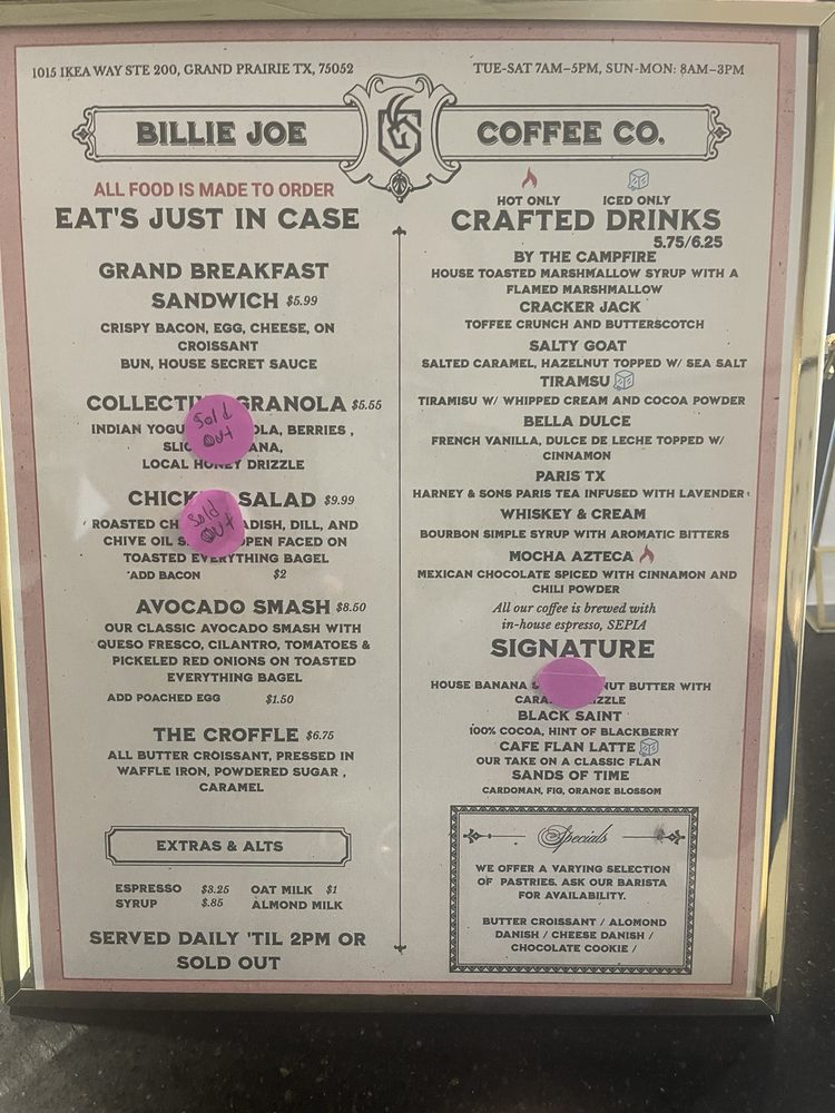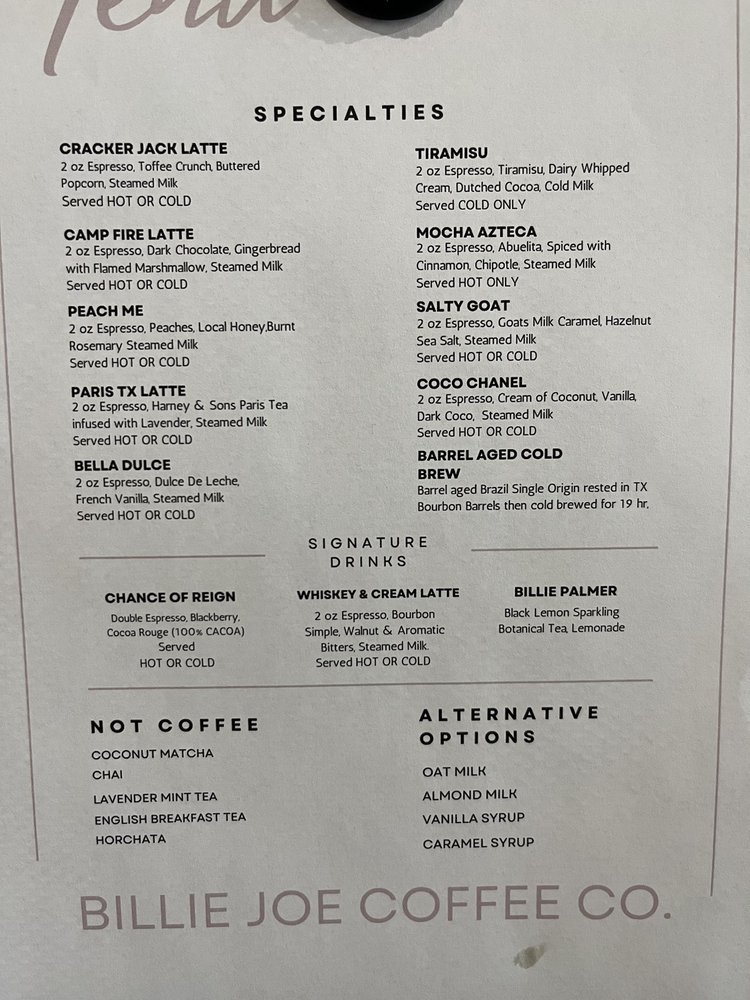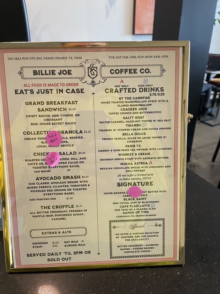 Billie Joe Coffee, located in Grand Prairie, TX, is a gem for coffee and tea enthusiasts. This black-owned, women-owned establishment offers a diverse menu with options for breakfast and brunch. Customers rave about the friendly and welcoming atmosphere, as well as the delicious drinks like the Mocha Azteca and Salty Goat. The unique blends and flavors, such as the cinnamon and chili powder spice in the Mocha Azteca, set Billie Joe Coffee apart from other coffee shops. With offerings like the croffle and specialty box coffee for groups, there's something for everyone to enjoy. The attention to detail in the drinks and the exceptional service make Billie Joe Coffee stand out as a must-visit spot for coffee lovers.